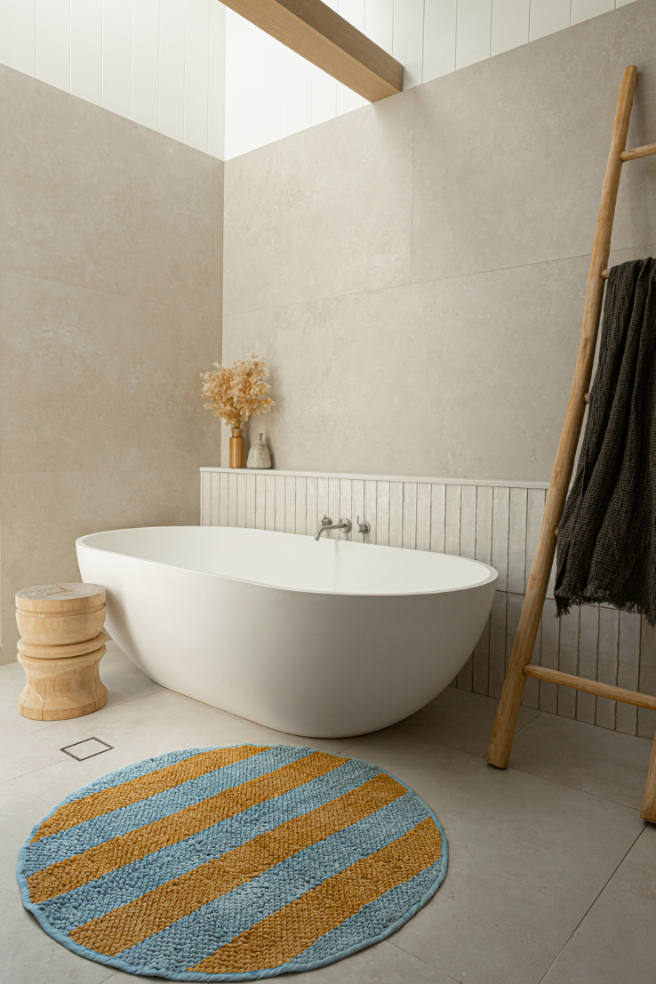 Round, radiant and ready to roll right into your bathroom! The Como Stripe Round Bath Mat is a bubbly burst of fun underfoot, combining cosy softness with playful texture and bold Kip & Co colour.