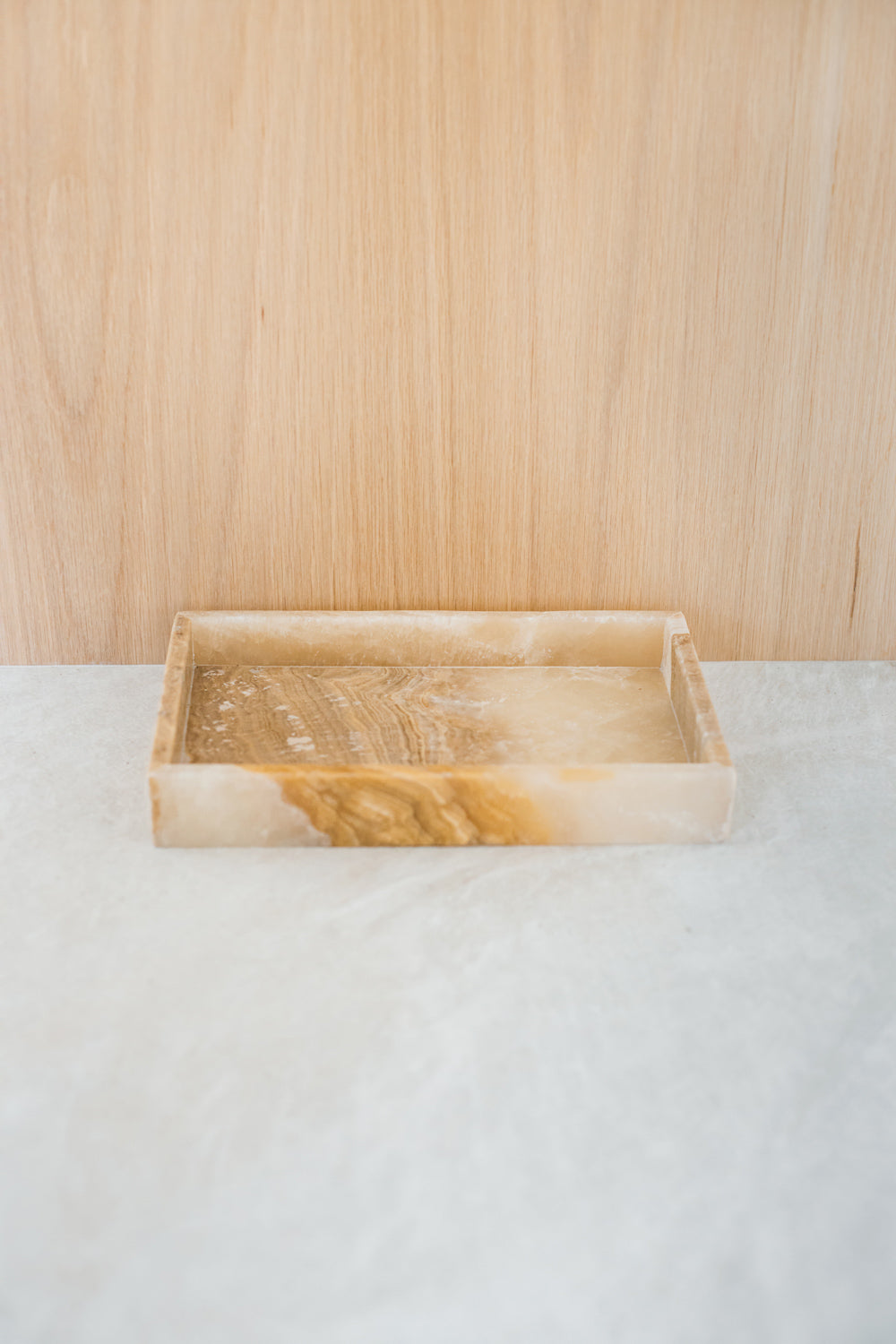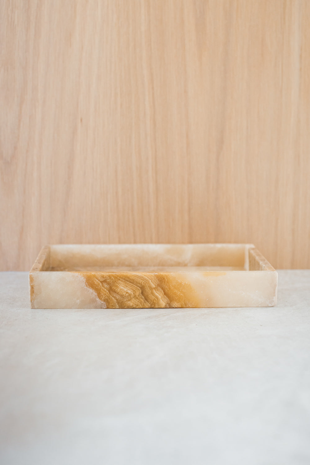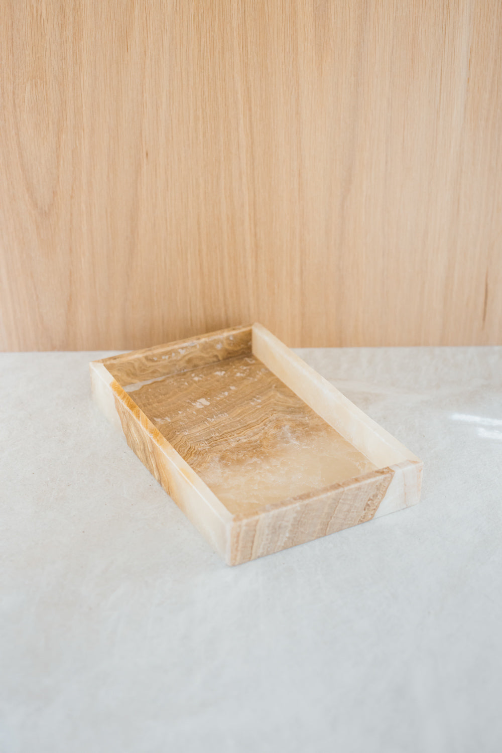 This beautiful onyx piece is a natural stone, resulting in each piece being unique with different colouring and patterning. Use this tray to hold jewellery in your bathroom, styling items in your living space or sit pretty on your coffee table.